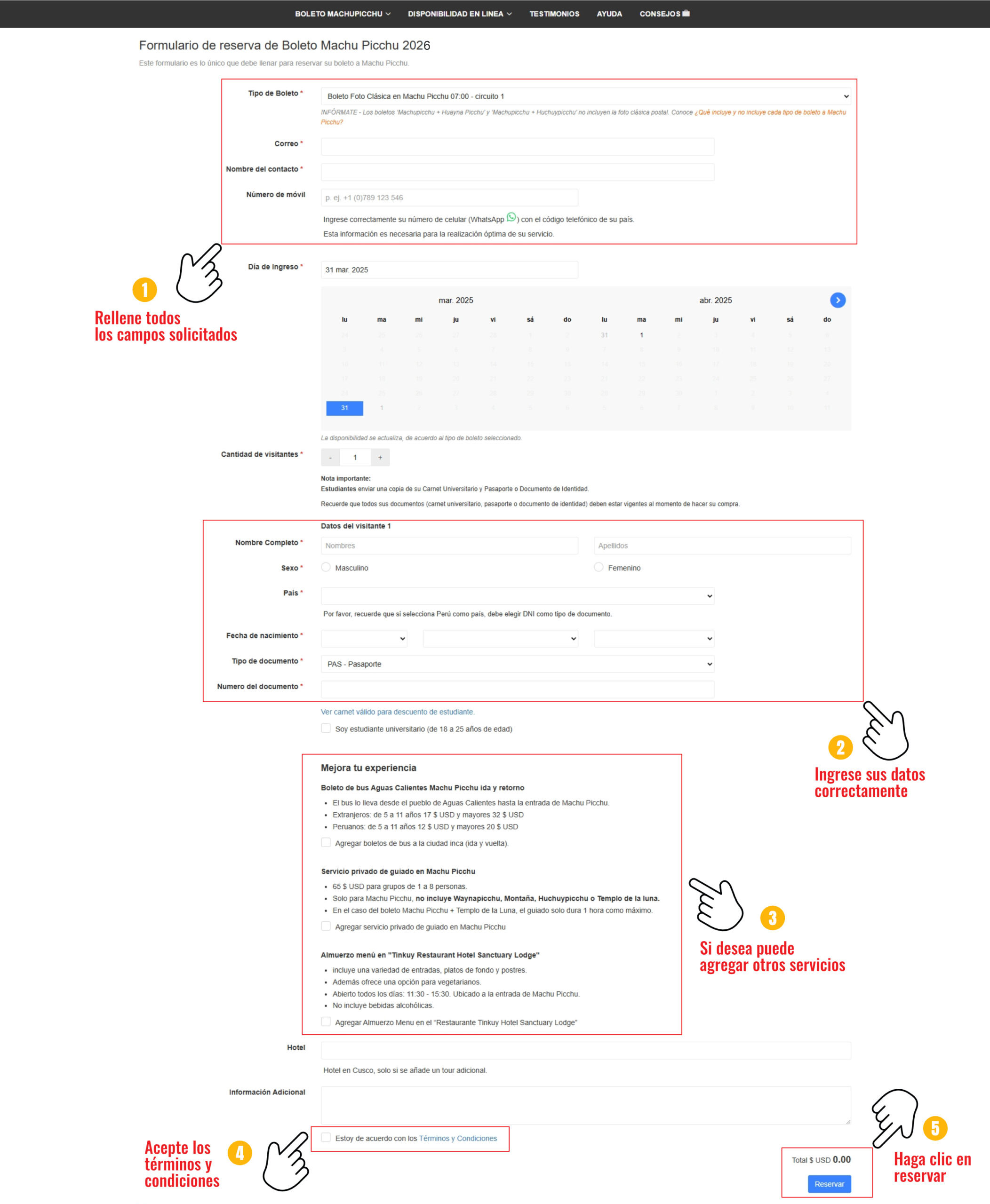 - Facoltativo: aggiungere servizi aggiuntivi come: a) biglietto dell’autobus da Aguas Calientes a Machu Picchu, b) servizio di guida turistica privata a Machu Picchu o c) pranzo a buffet presso il ristorante Tinkuy (l’unico situato vicino a Machu Picchu).