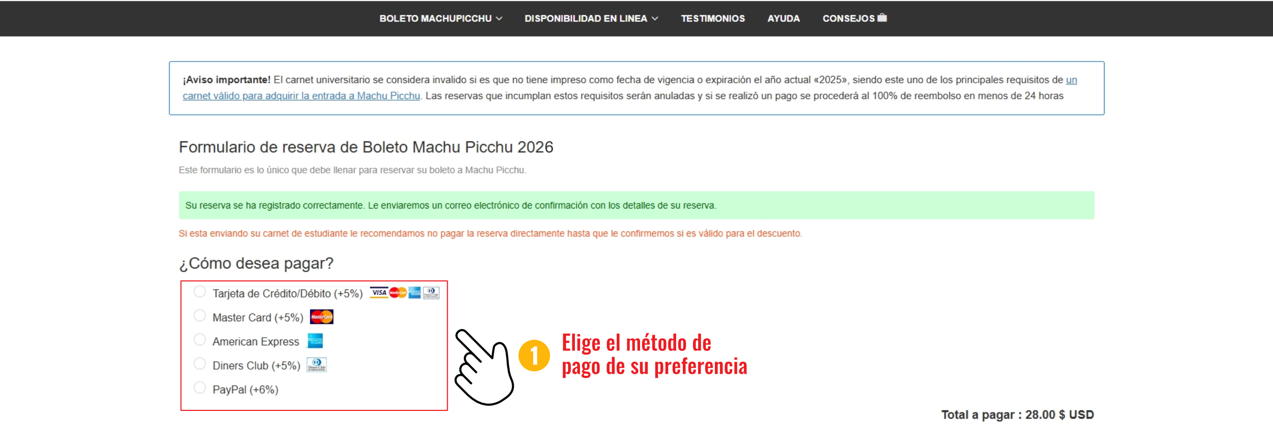 Il pagamento del biglietto per il Machu Picchu deve essere effettuato il prima possibile. Altrimenti, rischi che qualcun altro lo faccia prima di te e si aggiudichi il biglietto disponibile prima di te.