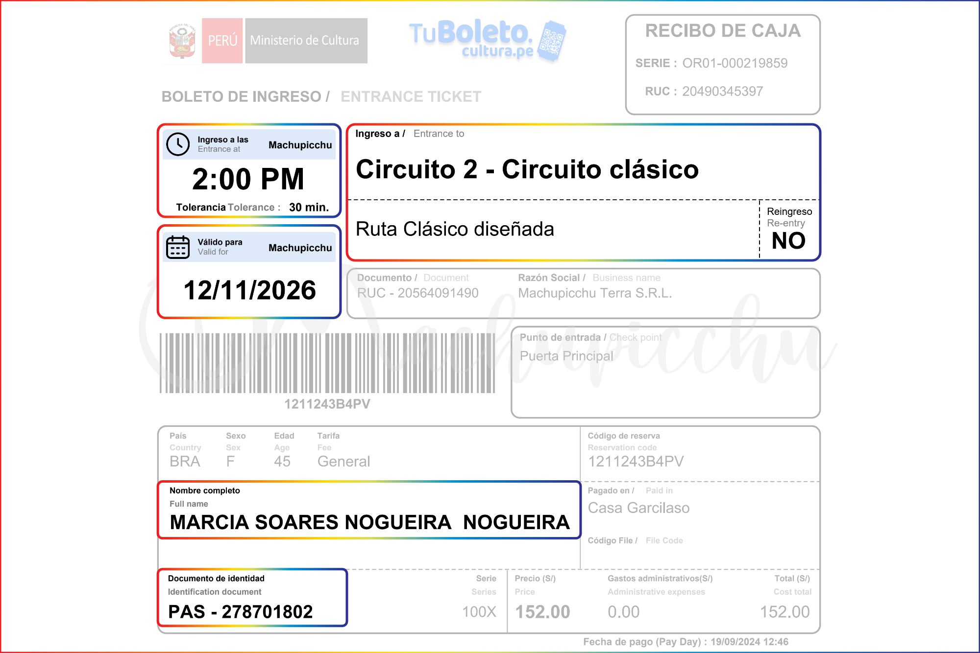 - Il biglietto è in formato PDF. Basta stamparlo e presentarlo il giorno in cui si entra a Machu Picchu.